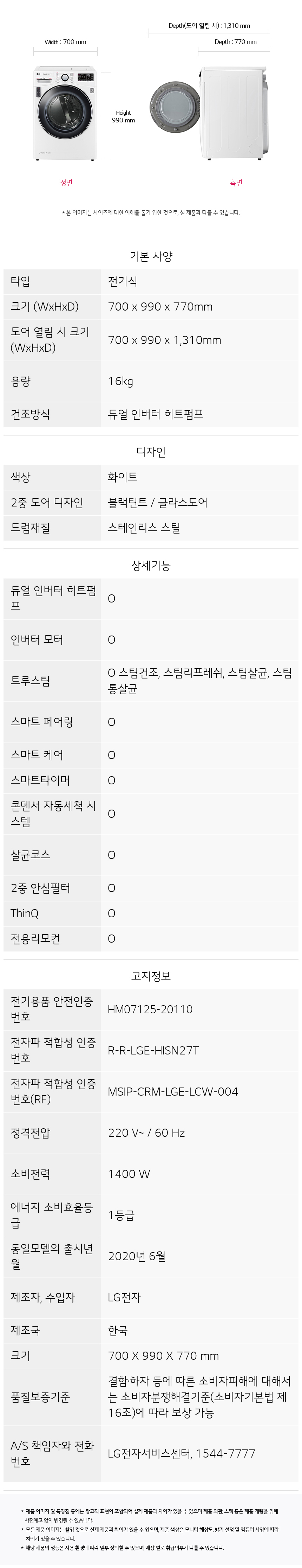 생활가전 LG TROMM 건조기 STEAM ThinQ RH16WT