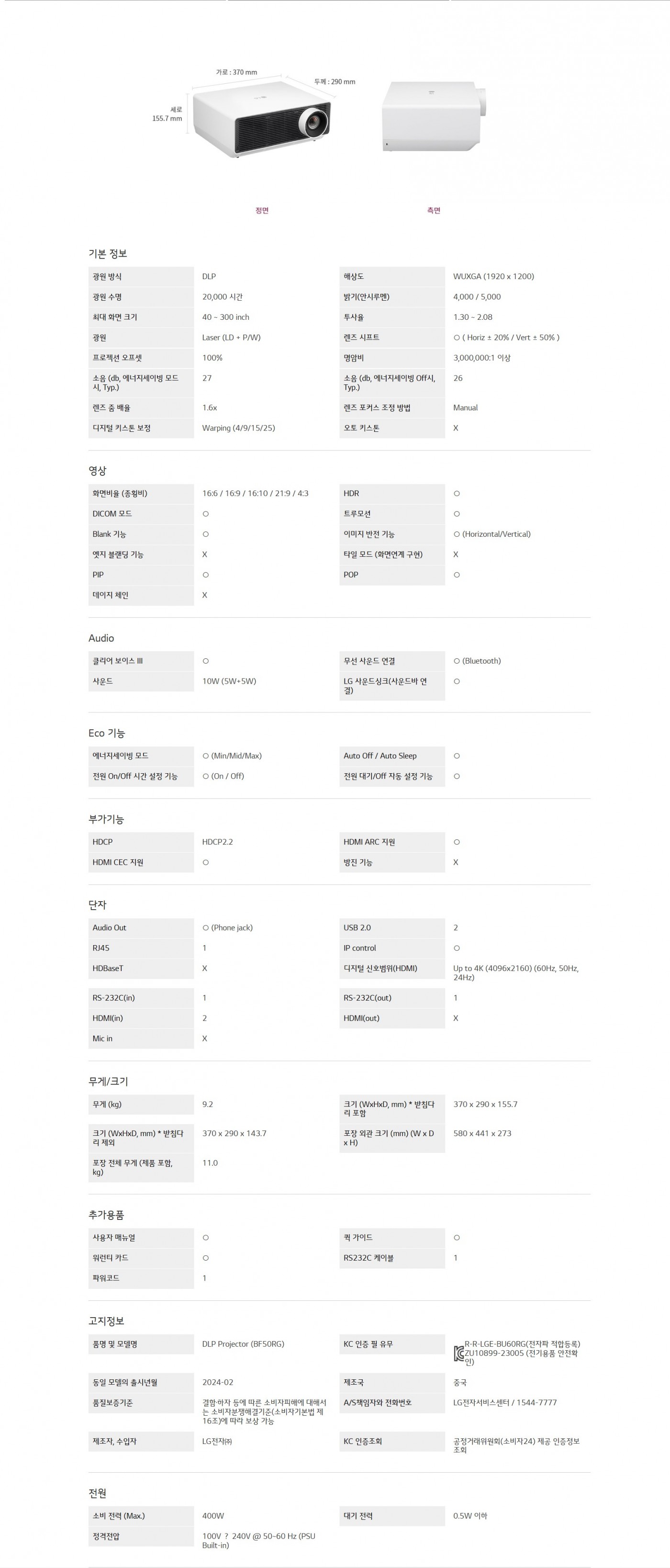 WUXGA 고화질 레이저 & 5,000 안시 루멘1.6배 줌 기능과 렌즈 시프트 지원SuperSign & LG ConnectedCare 원격 관리 솔루션